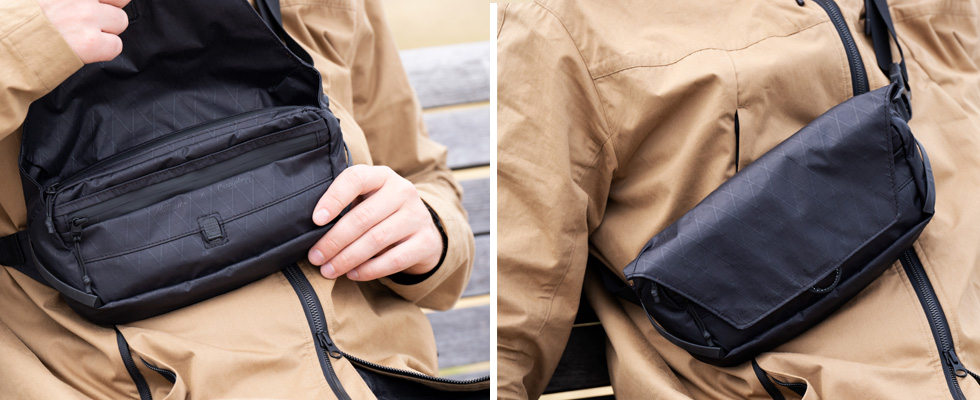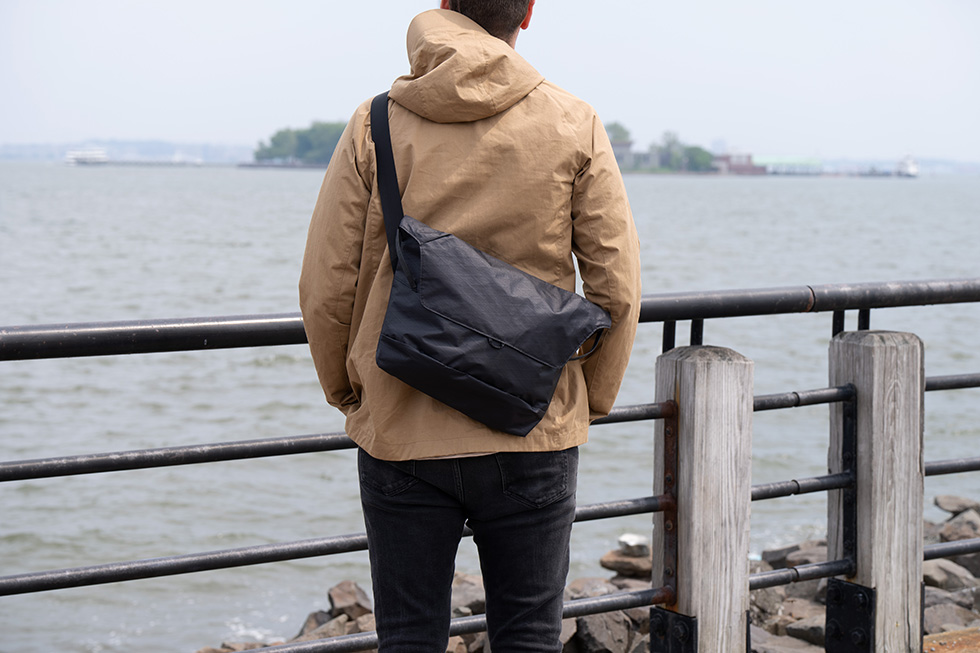Selecting the optimal volume for each product took some serious design thinking, with plenty of friendly back and forth among our teams as well as user research. Functional and packable into a main travel bag or pack was the primary focus for sizing. Ultimately, we selected 2 liters for the sling, 10 liters for the messenger (think large sling and small messenger), and 22 liters for the backpack. We found these three volumes were best suited to perform well for day-to-day EDC as well as traveling.