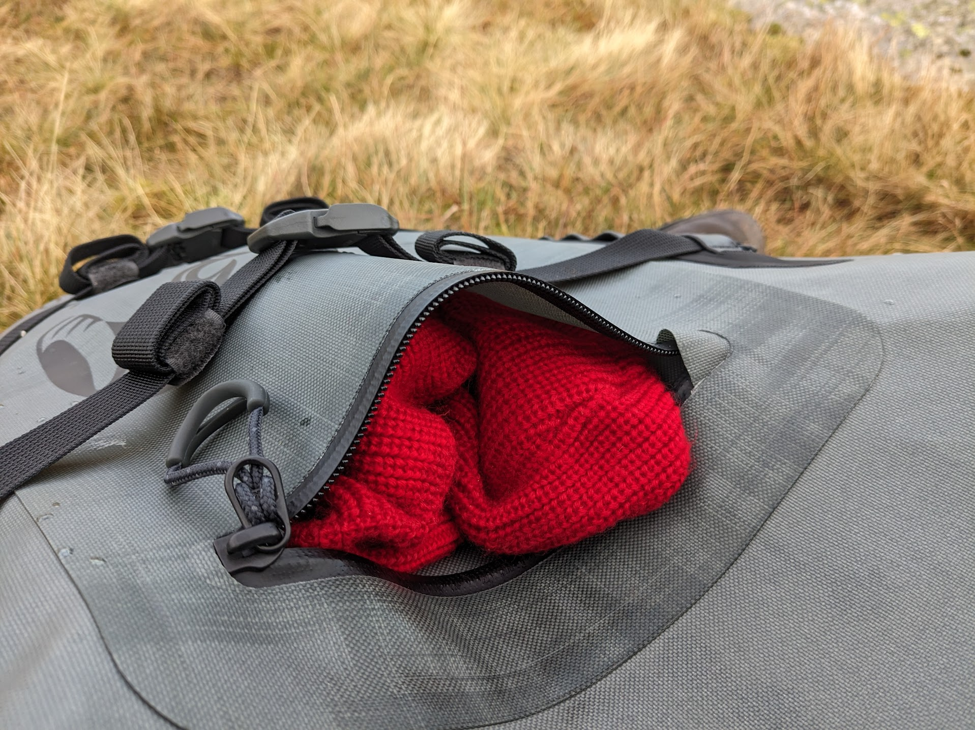 For small items, Kuiu have included one external pocket on the pack’s face side, closed with an Aquaguard zip. This is flat, with little volume to itself, and as such I found it hard to use with anything deeper than a notepad. Worse still, being zipped, this pocket isn’t as impermeable as the rest of the pack. After some particularly intense testing, I was disappointed to find that the wool hat I’d stowed inside had soaked.